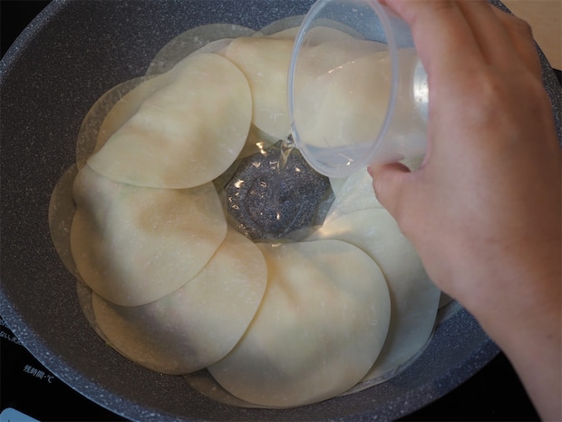 4. 中心に水50ml(分量外)を注ぎ、フタをして中火で5分ほど蒸し焼きにする。