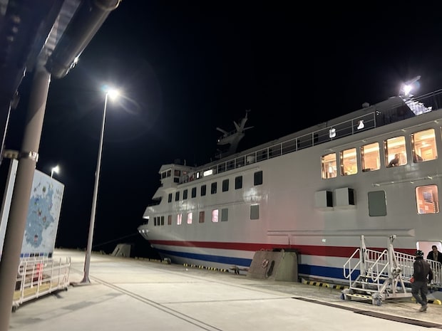 寒風吹き付ける深夜の港に到着し、予約していたレンタカーをピックアップ。