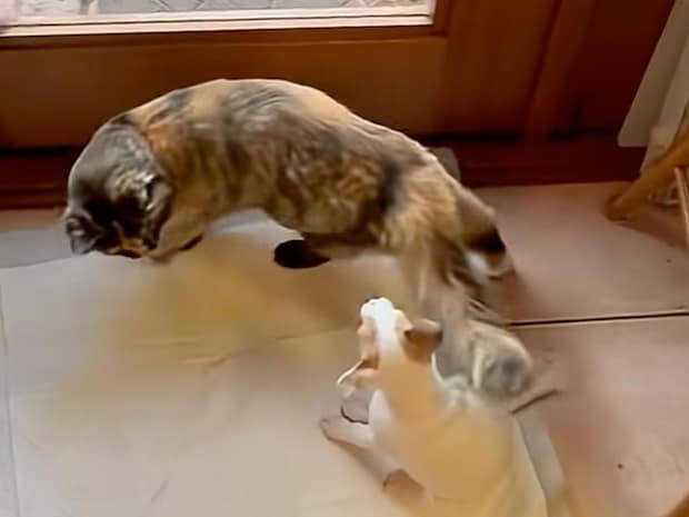 あっという間に、子犬さんの大群に囲まれる猫さん。