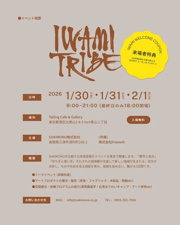 島根県・石見地方を拠点に、デザインや建築、宿運営など多角的なアプローチで地域の課題を解決してきたSUKIMONOが、地方から発信するものづくりの展示会「IWAMI TRIBE with SUKIMONO」を、1月30日(金)~2月1日(日)の3日間、東京・青山にて初開催する。