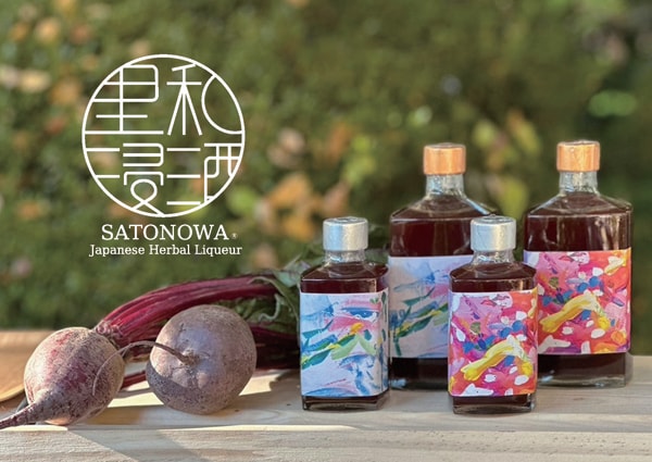 SATONOWA(里和浸酒)シリーズは、滋賀県草津市の太田酒造製造が酒粕をアップサイクルして作っている粕取焼酎を原酒に使用。そこに、地元で農薬を使用せず栽培されたビーツの規格外品や自家栽培のローゼル、国産のニガヨモギを浸け込み、国産の甜菜糖で甘みを加えた、ほろ苦くやさしい甘みが特徴のリキュールだ。