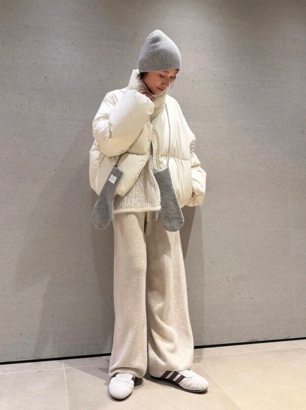 スポーティ&カジュアルな印象のパデットアウターは、ホワイトやエクリュカラーをチョイスすれば品よく女性らしさがUP。ボリュームのあるシルエットは活かしながらも、ポイントでグレーやベージュの小物をアクセントに差してメリハリを意識するのがぼってり見せないポイント。
