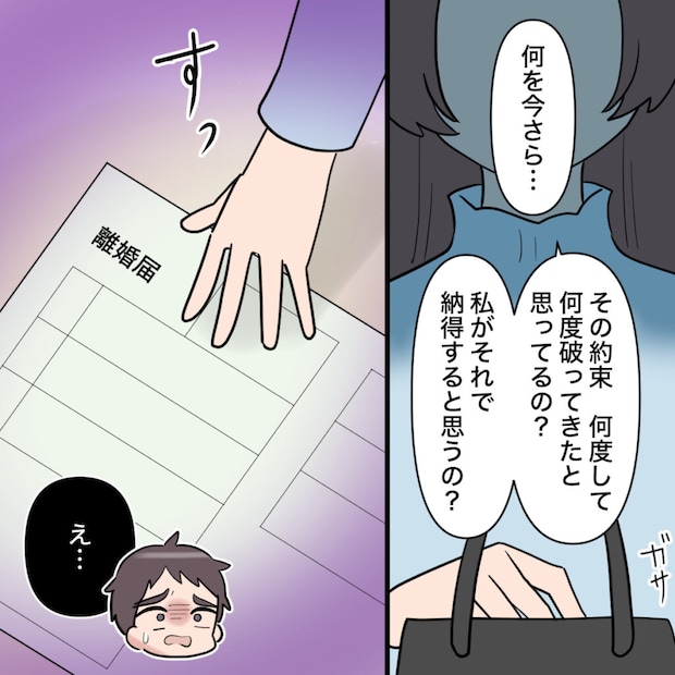「何を今さら・・・その約束、何度して何度破ってきたと思ってるの?私がそれで納得すると思うの?」そう言い切ると同時に、私はトモヤに離婚届を差し出したのでした。