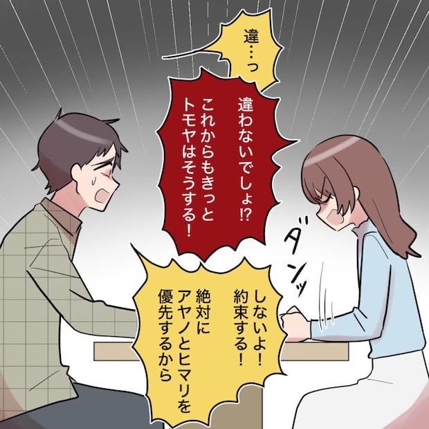 「違っ・・・」そう言いかけたトモヤに、私は反論の余地を与えませんでした。「違わないでしょ!?これからもきっとトモヤはそうする!」追い詰められたトモヤは、「しないよ!約束する!絶対にアヤノとヒマリを優先するから」と必死に声を荒げました。
