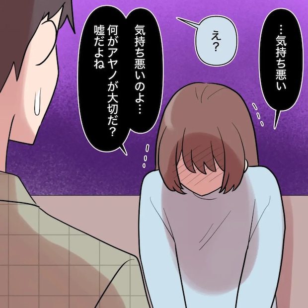 私は怒りで肩を震わせながら「・・・気持ち悪いのよ、何がアヤノが大切だ?嘘だよね」とつぶやきました。今さらそんな薄っぺらい言葉を向けられて、私が信じるとでも思っているのでしょうか。私のことを甘く見ているとしか思えません。