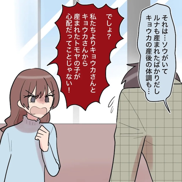 「それは・・・ソウがいてルナも産まれたばかりだし、キョウカの産後の体調も・・・」この期に及んで言い訳を並べるトモヤ。でも、これこそがトモヤの本音。私もキョウカさんと同じ状況だったにも関わらず、それでもトモヤは、私ではなくキョウカさんたちを選んだのです。どちらを大切にしていたのかなんて、考えるまでもありません。私は「でしょ?私たちよりキョウカさんたちの方が心配だったってことじゃない!」と声を荒げました。