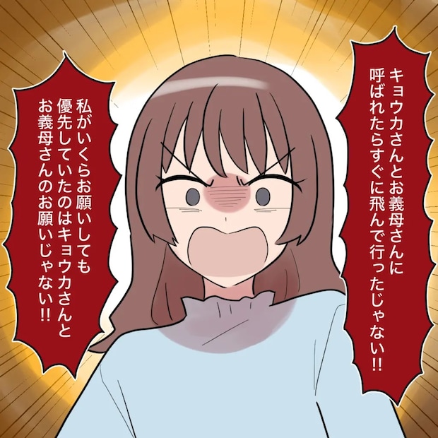 私はトモヤを鋭い目つきで睨むと「キョウカさんとお義母さんに呼ばれたらすぐに飛んで行ったじゃない!私がいくらお願いしても優先していたのはキョウカさんとお義母さんのお願いじゃない!」と怒鳴りつけました。