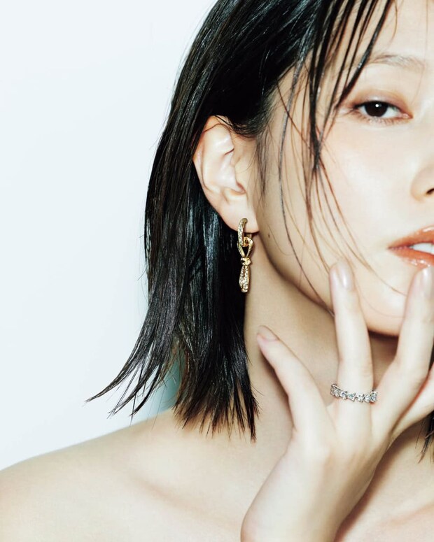 バゲットカット ダイヤモンドをセットしたオーバルのループに、ボウ(リボン)モチーフが連なるリンクイヤリング。愛らしいリボンがモダンに表現された、大人の心を掴む逸品。ピアス〈ティルダズ ボウ〉[YG×DIA]¥4,296,000、リング〈クラシック グラフ〉[PT×DIA]¥4,374,000(共にグラフ/グラフダイヤモンズジャパン)