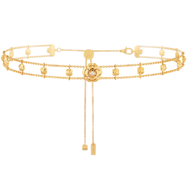 マドモアゼル シャネルのスタイルを象徴するモチーフとして、メゾンの重要なコードのひとつであるカメリアの花。それをジュエリーに昇華させた人気コレクションで狙いたい新作は、ミニマルなゴールドの花の中央にダイヤモンドをあしらったチョーカー。繊細でいて存在感たっぷり。