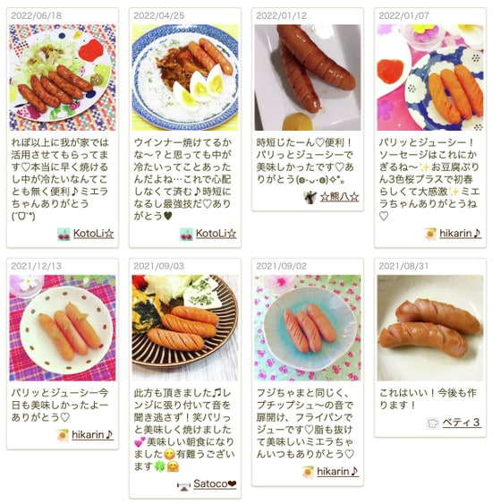 つくれぽ(作りましたフォトレポートのこと)にも「パリッとジューシーなウインナーがとってもおいしい」「お弁当においしくいただきました!」など嬉しい声が届いています。