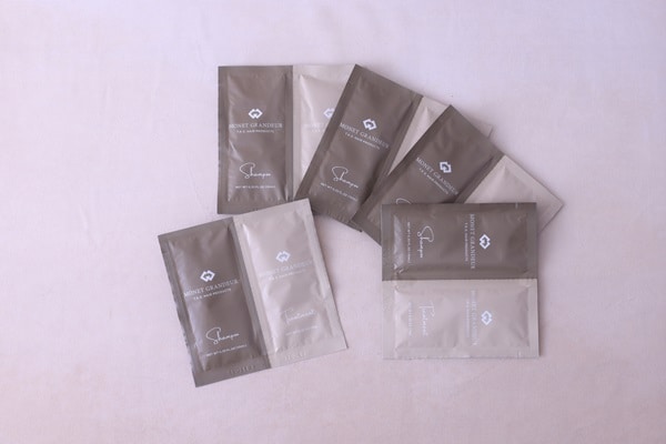 1つ目は、1回あたり約137円で試せる“品質体験セット”の販売。「高級ラインは気になるが、いきなり現品購入は不安」という人向けに特化している。「サシェセット(4回分)」550円(税込)は、高品質のシャンプー&トリートメントを自宅で実感できるトライアル仕様だ。