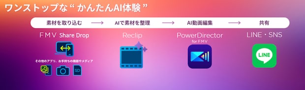 AIが自動で写真や動画などの思い出をまとめて動画を作成する、「Reclip」は、撮影した写真や動画をAIが自動解析し、旅行やイベント、人物や撮影場所ごとに整理・おすすめ表示することで、思い出をより簡単に振り返り共有できます。「PowerDirector for FMV」は、「Reclip」で選んだ素材からAIが自動で動画を生成。縦横比・長さ・テーマを選ぶだけで編集が可能で、テキスト挿入や切り抜き範囲の自由な選択も可能です。この写真・動画解析アプリ「Reclip」と自動編集アプリ「PowerDirector for FMV」により、写真や動画の整理から編集、共有までをAIがワンストップでサポートしてくれます。ローカル処理によりセキュリティ面も安心なのもポイントです。