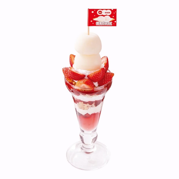 「いちごと雪見だいふくのパフェ」は、「ミニ雪見だいふく」を2個のせた、高さ約25センチのボリューム満点な「タワーパフェ」です。サクサクの紅茶風味パイやマスカルポーネクリーム、イチゴゼリーなどが味わえます。価格は999円(税込み)。