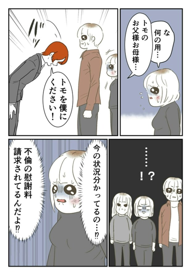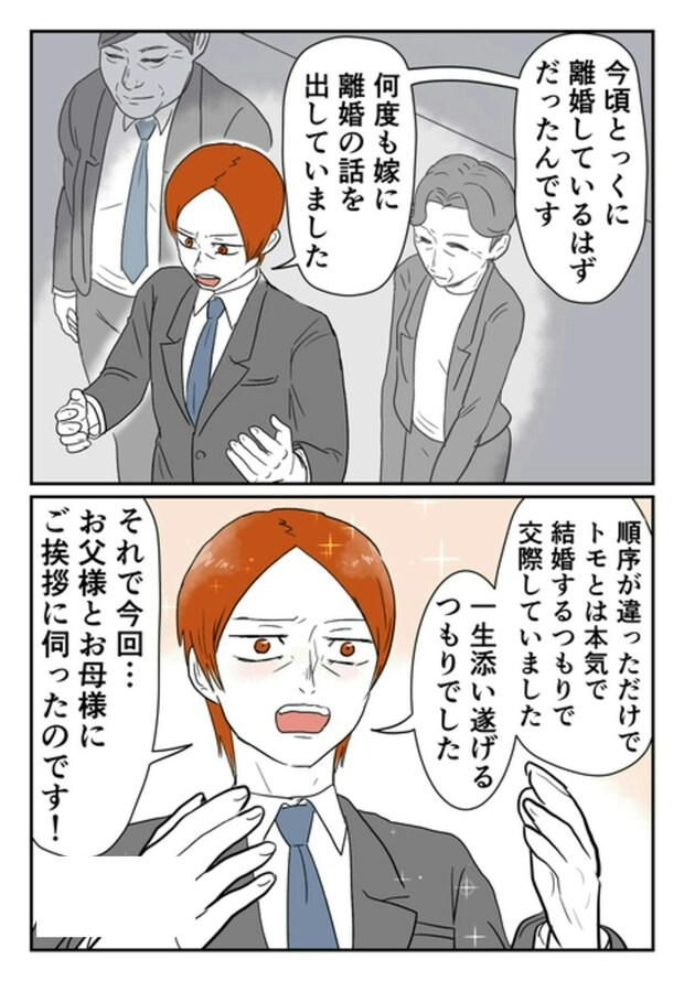 ですが今度は、両親とともにあらわれたモト。まだ離婚は成立していません。それなのに、結婚のあいさつに来るなんて…。順番がめちゃくちゃです。