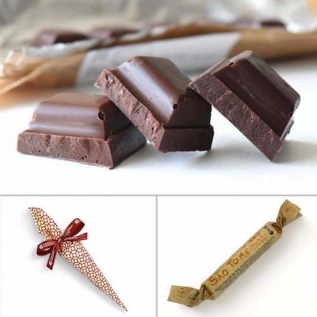 ポルトガルにある「ショコラタリアエクアドル」の、ダークながらもしっかりと甘さを感じる「ミニバー ダーク 58%」(864円、写真上)、見た目のかわいらしさとは裏腹に贅沢な味わいな「パラソルチョコ ダーク」(756円、左下)、小気味良い食感のカカオニブ入りの「ミニバー サントメダーク ニブ入り 68%」(864円、右下)