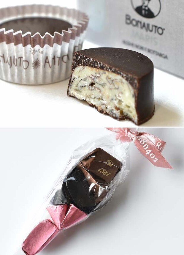 上/イタリア・シチリアの老舗「ボナイユート」が作る「海苔+ボッタルガ」(1,188円)。ボッタルガとはからすみのことで、ひと粒食べると磯の香りに包まれる 下/「バルベーロ」のヘーゼルナッツペーストチョコレートを合わせた「ミニジャンドゥイオッティ9粒詰め合わせ」(1,360円)は、ミルク、ダーク、コーヒー風味の3種類がミニサイズのセットに