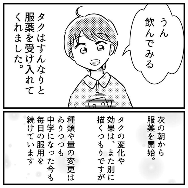 担任やスクールカウンセラーなど周りの力を借りながら、ありのままのわが子と向き合う母の葛藤を描きます。発達障害の症状を抑えるため、息子は薬を服用することになりました。