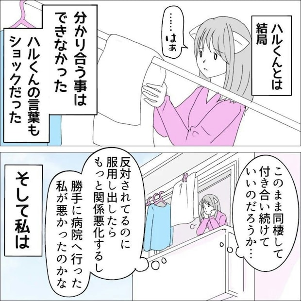結局ハルくんとはわかり合えなかったみわ柴ちゃんさんは、このまま同棲し付き合いを続けてもいいのかと悩んでいました。そこで母親に電話で相談してみることに。「PMSのせいでいまこのような状況になっている」と詳細を話すと母はハルくんの肩を持ち…。