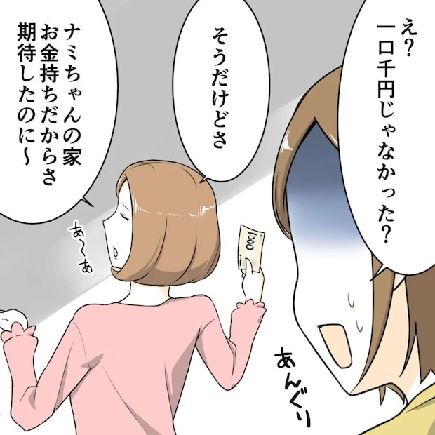 ナミちゃんのママは、近所に住んではいるもののそれほど親しくなかったハルちゃんママから突然カンパを求められ戸惑います。理由を聞くと、娘のハルちゃんが全国大会に出場することになり、応援に行きたいからだそう。ナミちゃんママは「現金がない」と言ってやんわり断ろうとしますが、一歩も引かないハルちゃんママ。「明日また来るから準備しておいて」と強引に話を進め、帰っていきました。ナミちゃんママはきっぱり断らなかったことを後悔しつつ、そういえば昔から子どもの年齢を偽って料金を安く済ませようとしたり、習い事の送迎を強引に押し付けてガソリン代を節約しようとする厚かましい人だったなと、ハルちゃんママの非常識さを思い出します。ハルちゃんママの主張を思い返し、やはり納得できないと思いなおしたナミちゃんママ。翌日笑顔でお金を回収に来たハルちゃんママに「わざわざ来てもらって申し訳ないけど、カンパはできない」とはっきり伝えました。しかし、ハルちゃんママは何が何でもカンパを受けようとしてきます。お金を渡さないと帰ってくれないと悟ったナミちゃんママは、渋々財布から千円札を取り出して、ナミちゃんママに渡しました。するとその瞬間、ナミちゃんママは表情を変えて「えっ?千円だけ?」とつぶやいたのでした。