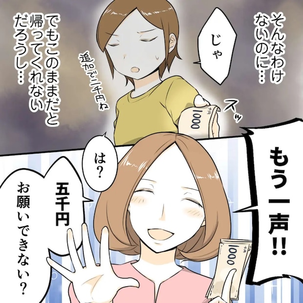 そんなわけないのに、でもこのままだと帰ってくれないだろうし・・・私は渋々ながらも、追加で二千円を渡します。しかし、ハルちゃんママはそれでも納得がいかないようで、「もう一声!五千円お願いできない?」と厚かましく聞いてきました。