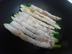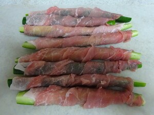 1. 縦1/4に切ったきゅうりに、豚肉の薄切りを巻きつけます