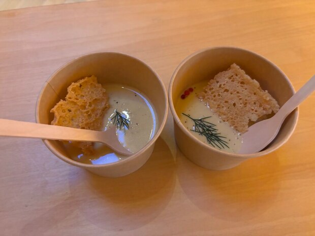 カボチャやカブを使った温かい野菜のスープの提供もありました。スープはもちろん、このチーズとお米で焼いたチュイルも絶品!今まで遊びに夢中だった子どもも、スープの提供時だけはプレイエリアからすぐに離れて遊びよりもスープに夢中でした。