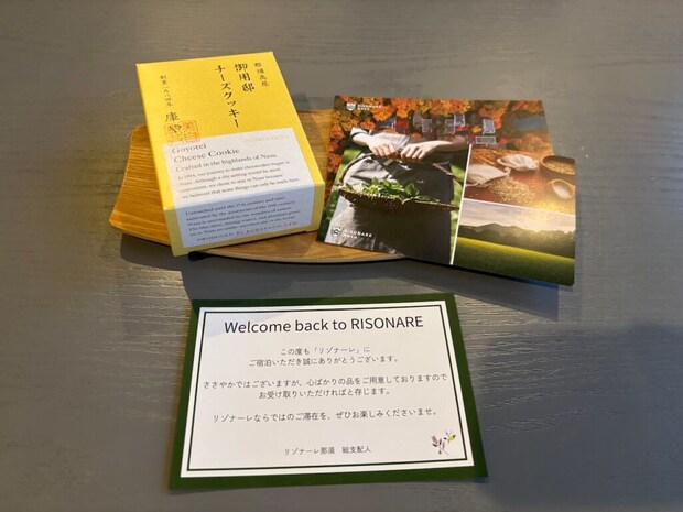 寄り道した後は、『リゾナーレ 那須』に到着。チェックインを済ましてお部屋に入ると、リゾナーレからお菓子のプレゼントが。この御用邸チーズクッキーは濃厚なチーズの味わいに黒胡椒がアクセントになっていて、クセになるおいしさです。