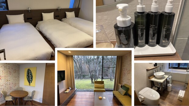 今回宿泊したのは、別館の客室。緑をテーマカラーとした客室は、那須に生い茂る木々をイメージしているそうです。大きな窓からはお部屋の中からでも大自然を満喫できるので、癒される空間でした。