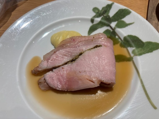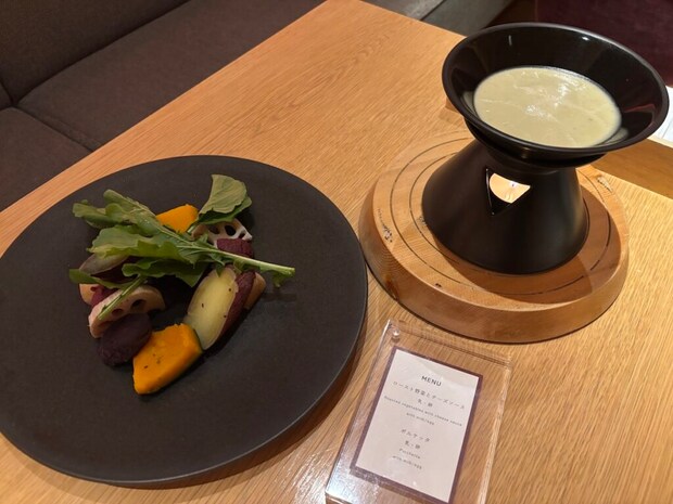 リゾナーレの新鮮で甘くておいしい野菜たちに食事中、何度も魅了されます。前菜はロースト野菜とチーズソース。濃厚なチーズソースにロースト野菜と絡めていただくと、もう絶品です。この余ったチーズソースは、パンやエビのフリットなどにも付けて最後までおいしくいただきました。