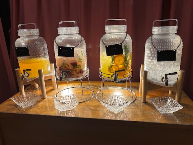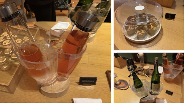 夜限定でアルコールとハーブティー、ミックスナッツの提供も。このスパークリングワインは普段辛口を飲まない筆者でも非常に飲みやすかったです。