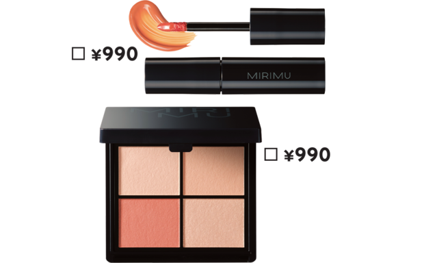 【ミリム▶ALL990円で65品をラインナップ】“すべての人の魅力を引き出すブランド”がコンセプト。上から:しっとり質感! ミリム モイストティント アプリコットベージュ、チークにもOK。同 マルチアイシャドウパレット アプリコットピーチ 各¥990(共にNuzzle)