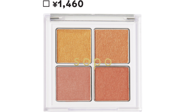 【sopo▶アーティストが生み出した旬シェード】朝の日差しを思わせるゴールドとオレンジ、ニュートラルピンクの組み合わせが、ヘルシーな色気を醸し出す。透け感があって軽やかだから、どう重ねても旬なムードに! sopo アイパレット 08 ¥1,460(ノイン)