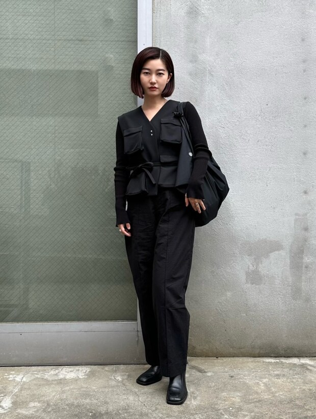 ディテールをポイントにしたモードなオールブラックコーデ。「削ぎ落としたシンプルなコーディネートにデザイン性のあるベストを合わせました。ミニマルなスタイルにギミックがきいたアイテムをワンポイントに合わせることが多いです」