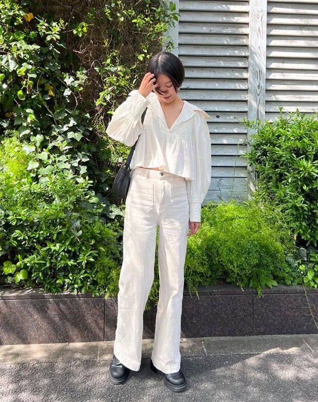モノトーンは定番スタイルですが、最近は白多めが気分。「ブラウスの甘いディテールとバランスを取るため、小物はブラックのレザー引き締めました。真っ白ではなく、ややエクリュ寄りのホワイトで優しくカジュアルな印象にまとめたのもポイントです」