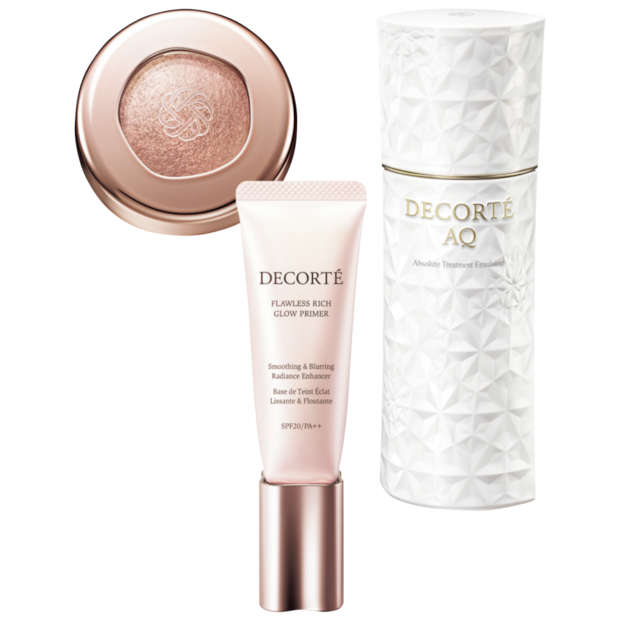 左から:コスメデコルテ アイグロウジェム スキンシャドウ 12G ¥2,970、同 フローレススキン グロウライザー SPF20/PA+++ 30g ¥4,950、同 AQ アブソリュート エマルジョン マイクロラディアンスⅡ 200mL ¥11,000(全てコスメデコルテ)