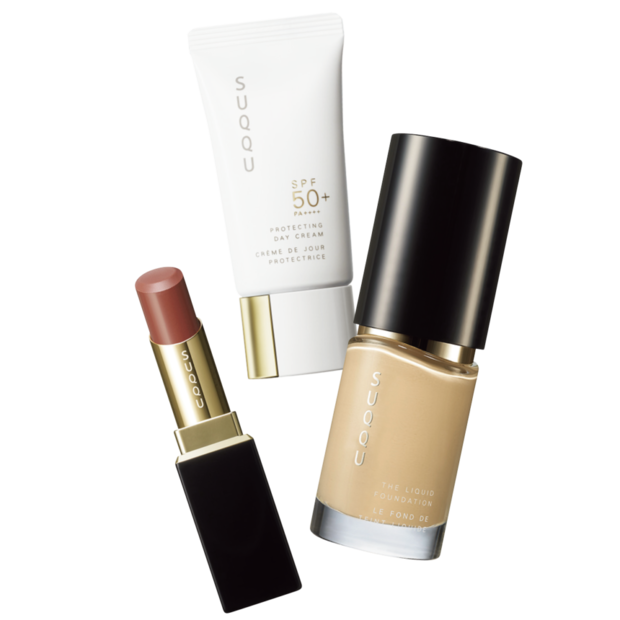 ワンランク上の美肌をゲット。 左から:モイスチャー グレイズ リップスティック 06 ¥5,830※セット価格、プロテクティング デイ クリーム SPF50+/PA+++ 30g¥7,700、ザ リクイド ファンデーション 115 SPF15/PA++ 30mL ¥11,000(全てSUQQU)