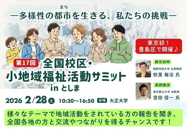社会福祉法人豊島区民社会福祉協議会は、域福祉活動の活動者が実践報告を行い、参加者と交流するる「第17回全国校区・小地域福祉活動サミットinとしま」を、2月28日(土)に大正大学で開催する。