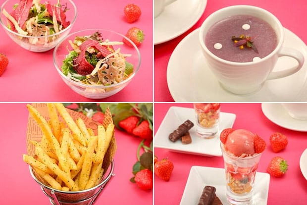 ティースタンドに並ぶメニューのほかにも、パリパリ食感が楽しい「蒸し鶏と根菜チップのパリパリサラダ」や、優しい甘さの「紫芋のポタージュ」、「フライドポテト サワークリームフレーバー」などが用意されるのもうれしいポイント。