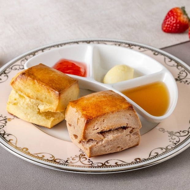 中段に配されるアフタヌーンティーに欠かせないスコーンは、プレーンとストロベリーの2種類が登場。濃厚なクロテッドクリームや甘酸っぱいストロベリージャム、香り高いメープルシロップをたっぷりと添えて召し上がれ。