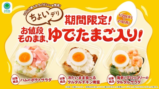 また同日から2月9日(月)までの期間限定で、「ちょいデリ」シリーズの一部商品にゆでたまごをトッピングし、価格を変えずに販売する。対象は「ハムのポテトサラダ」など全3種。