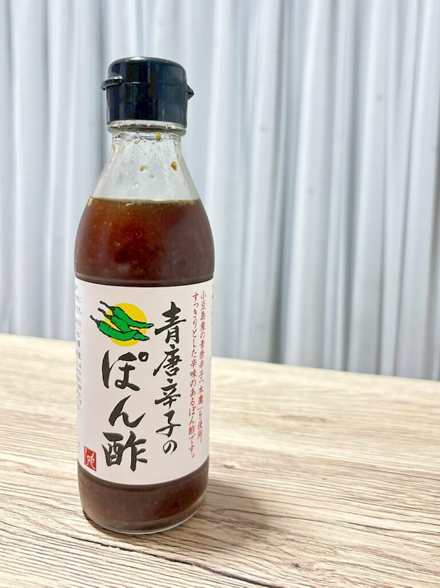 この青唐辛子ぽん酢は、爽やかな酸味のぽん酢に、青唐辛子のピリッとした辛みが効いた大人味。