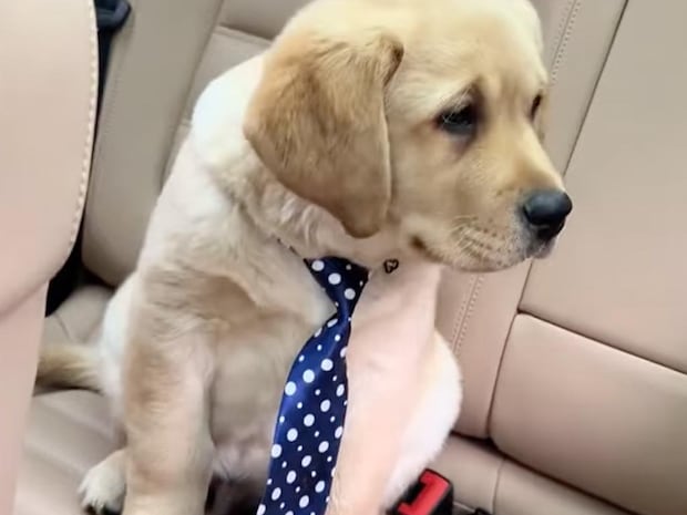 車の助手席にちょこんと座る犬さん。