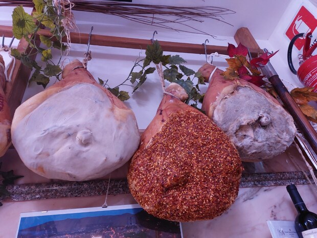 しかし我が家は、5代続く近所の豚肉専門店で購入。スーパーで売られているものはすでに加工されていて温めるだけで食べられますが、こちらは調理が必要です。ちなみに、このお店では生ハムも写真のように天井から吊るされています。