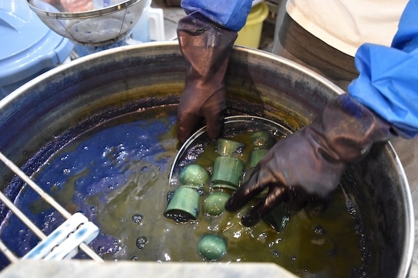 藍一つとっても、染め方も色々、さらに濃淡の色合いで藍の呼び名もさまざま。藍の葉を発酵して作られた染色液に何度もつけ込み、重ねて染める工程や、茜草の根から抽出した煎液で希望の色合いになるまで染色を繰り返す作業には、手間暇がかかる。