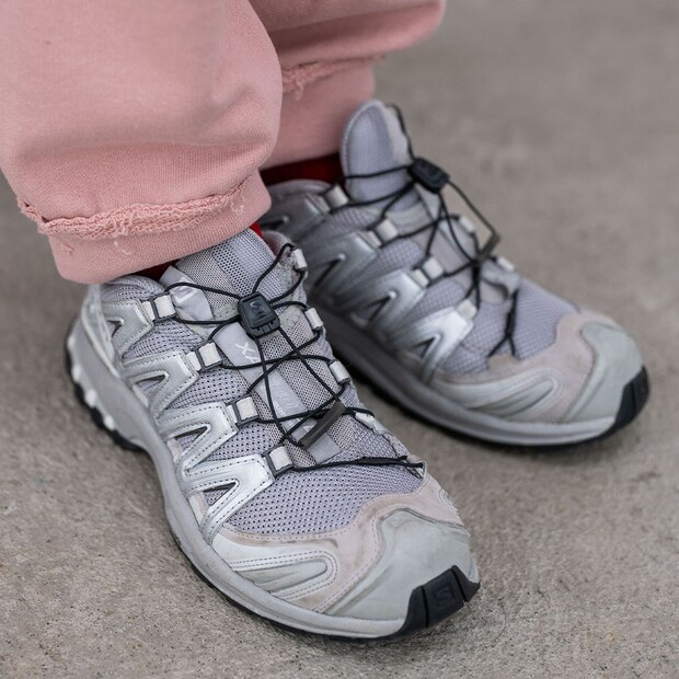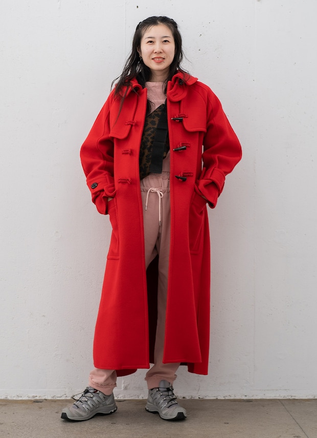 『サロモン』のスニーカーはライトグレーをチョイス。エレガントなロング丈のコートを、スポーティアイテムで崩したのがグッド!