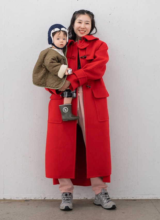インパクト大の赤いロングコートでママが主役! スウェットセットアップやスニーカーを合わせて、程よくカジュアルダウンしたのがポイント。キッズの『西松屋』や『ZARA』を上手くつかったプチプラMIXコーデもぜひお手本にしたい。