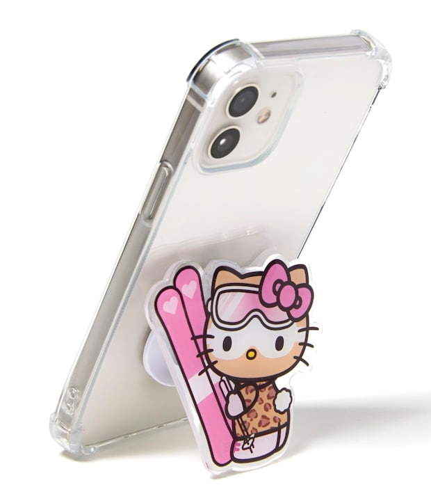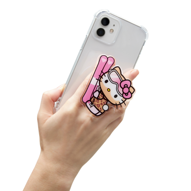大きな雪焼けハローキティがインパクト抜群の折りたたみスマホグリップ。裏面の剥離シールをはがして、樹脂製など凹凸のないスマホケースに貼り付けて使用してください。開き方を変えれば便利なスマホスタンドにもなる!