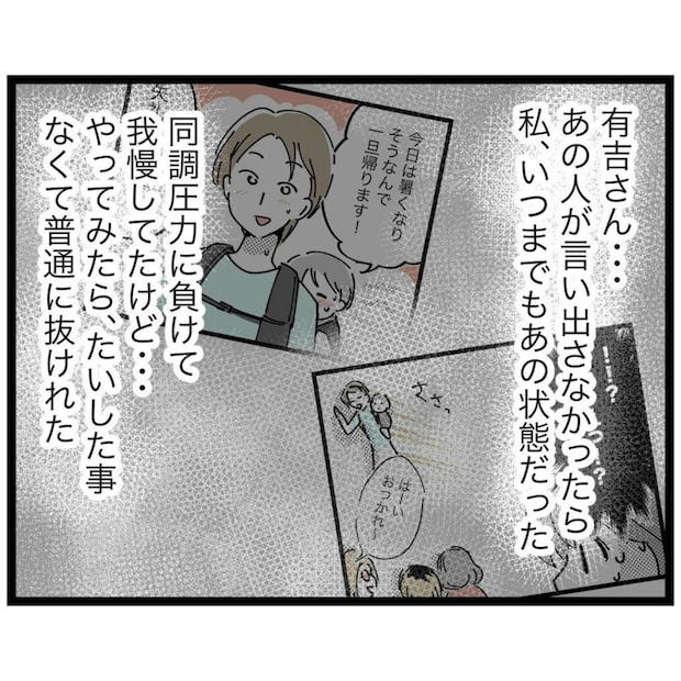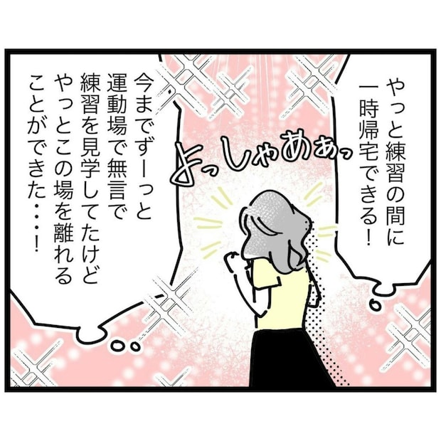 同級生の保護者にならい、思いきって途中で練習を抜け出すという選択をしたもっつんさん。これまで感じていたスポ少の保護者間の同調圧力に、初めて自分の意思で立ち向かい、一歩を踏み出すことができました。