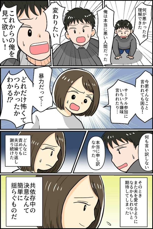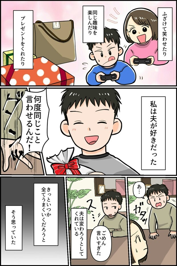 優しくて愛情深い夫は少しずつ変わり、乱暴に主人公を支配する人になります。モラハラは、いいときと悪いときがまるで別人のように感じることがあると言います。そのせいで、主人公のように謝罪をされると怒らせてしまった自分が悪いと思い込んでしまう傾向があります。