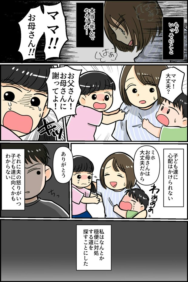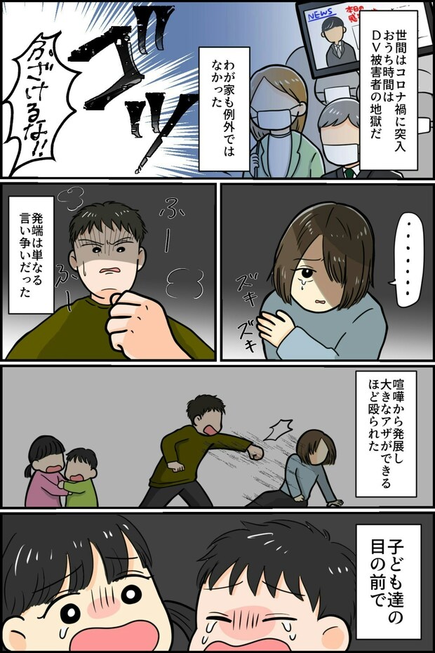 もう一度信じよう、という繰り返しでどんどんひどくなっていくモラハラ。ついに主人公は暴力を受けるようになります。主人公も子どもたちもとても怖い思いをしたでしょう。